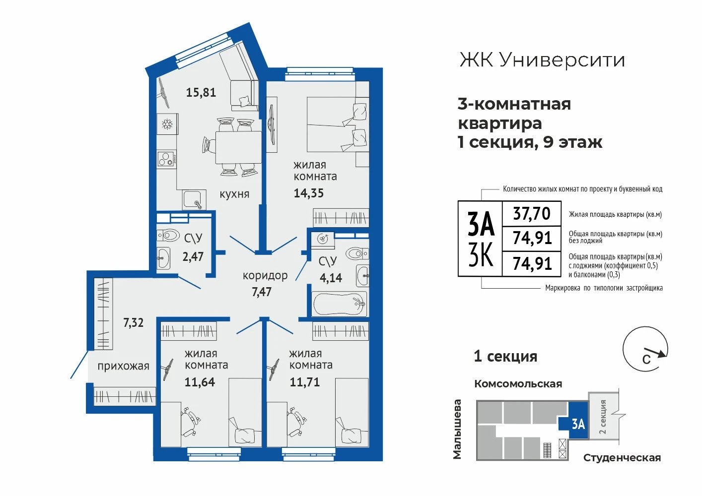 3-комнатная квартира №563-комнатная квартира №56