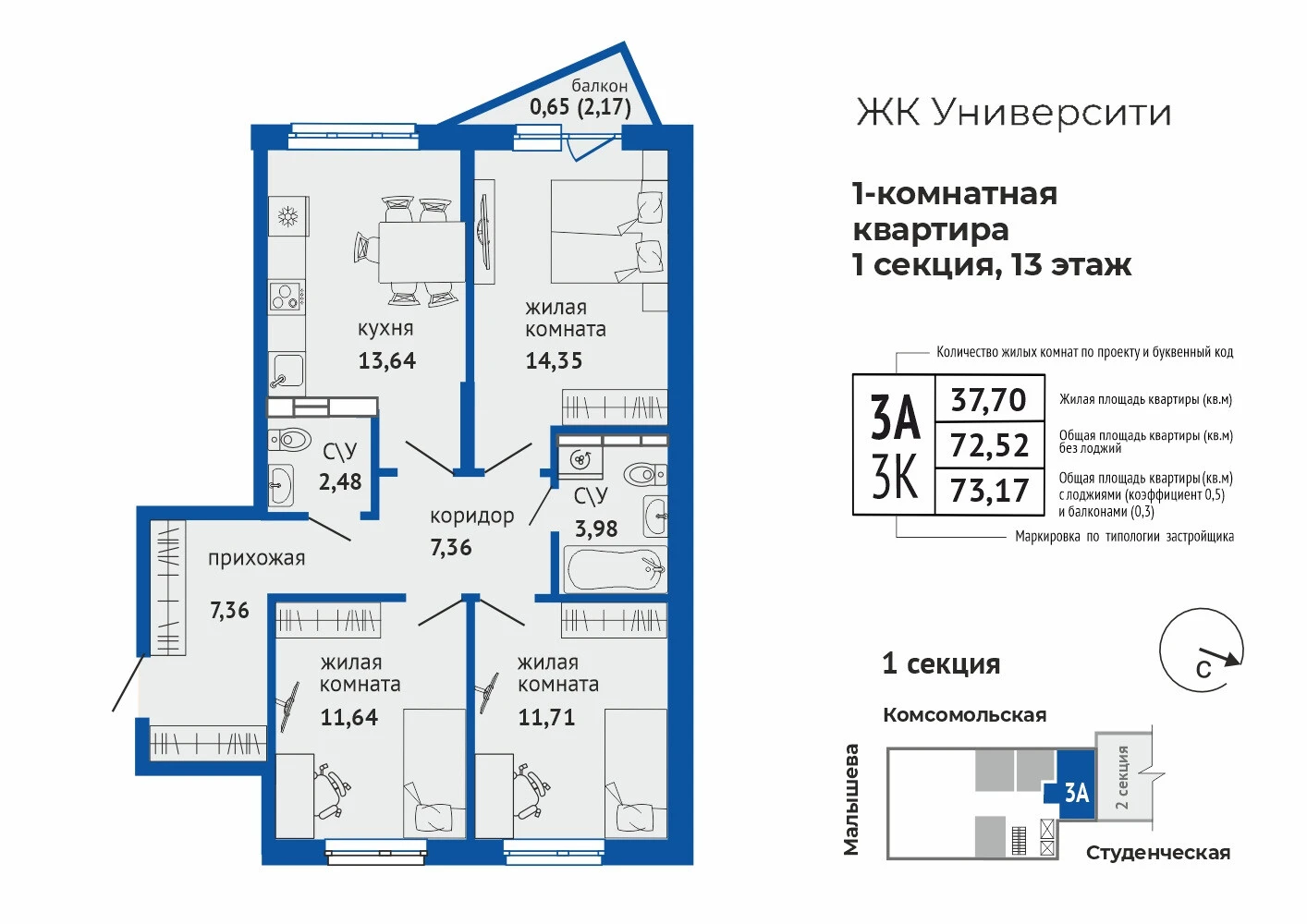 3-комнатная квартира №733-комнатная квартира №73